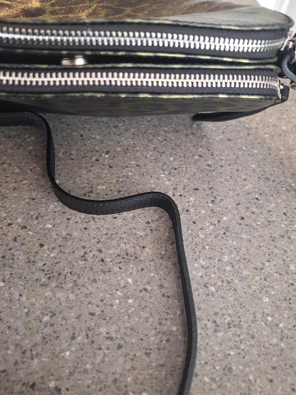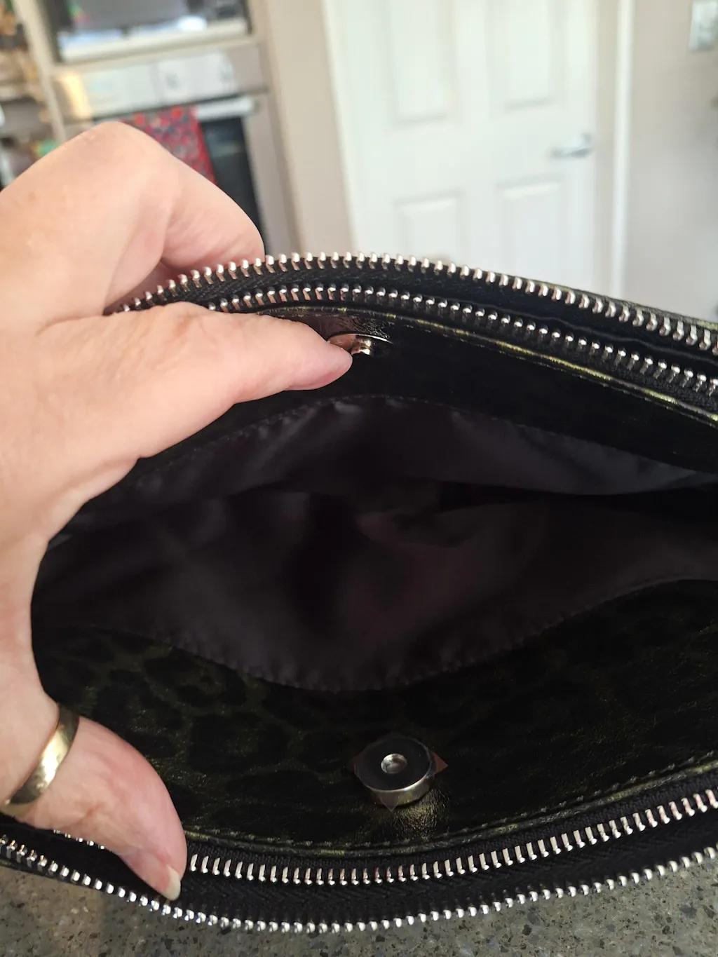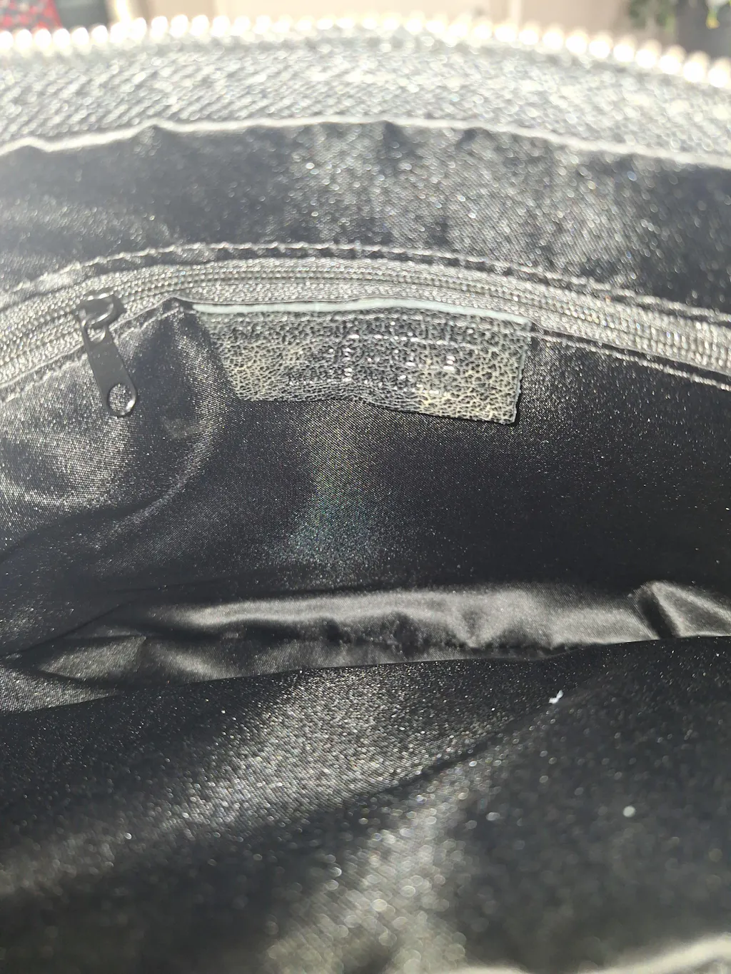 Gorgous colour with a lovely shine to it!! Great size multi apartment bag, great domed pocket in the middle perfect for phone and two strong chunky zip compartments as well as 2 inner pockets 1 open and one zipped. Truley an awesomely designed bag!!!