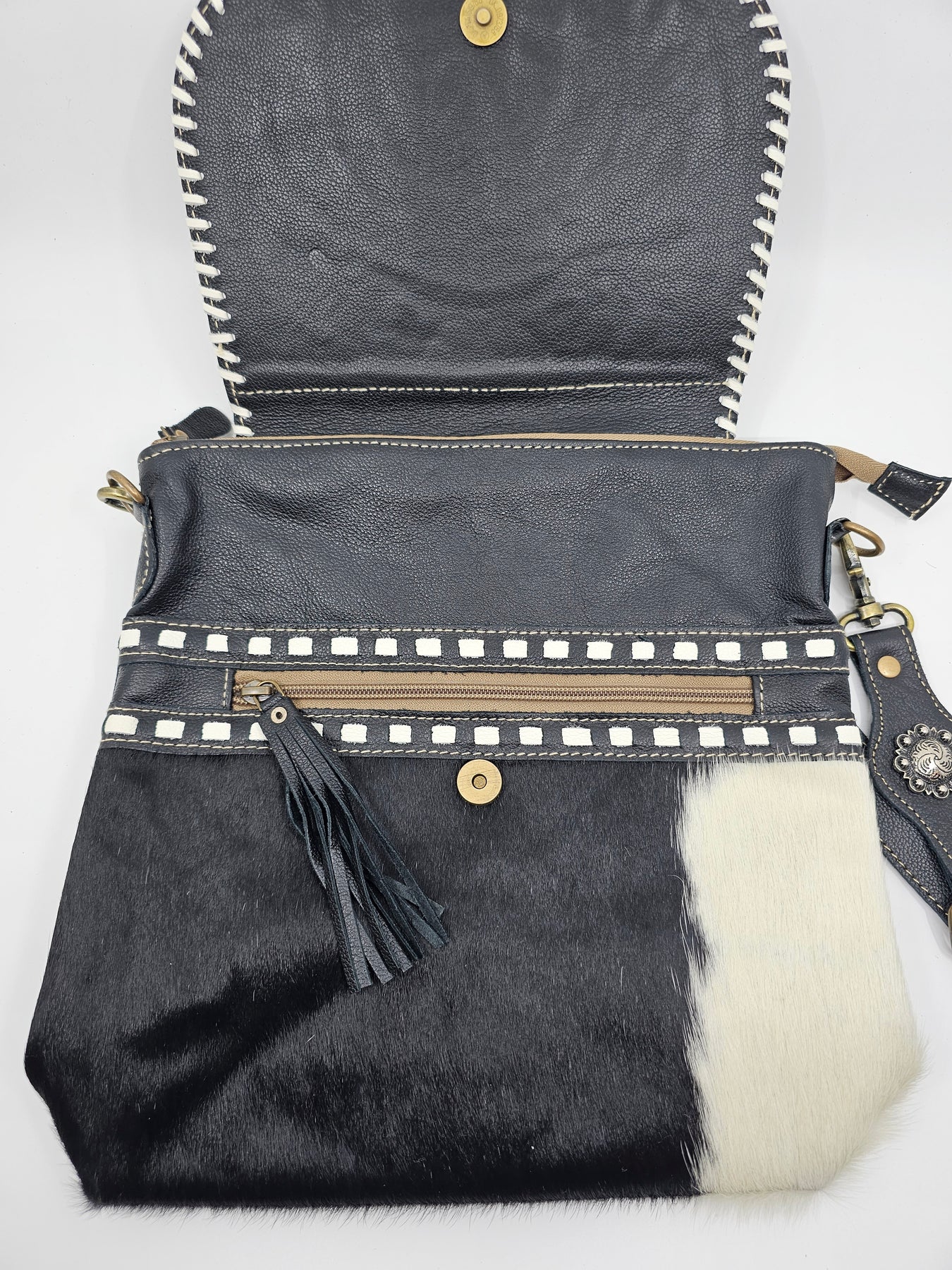 - Unique one-of-a-kind jet black & white cowhide on front