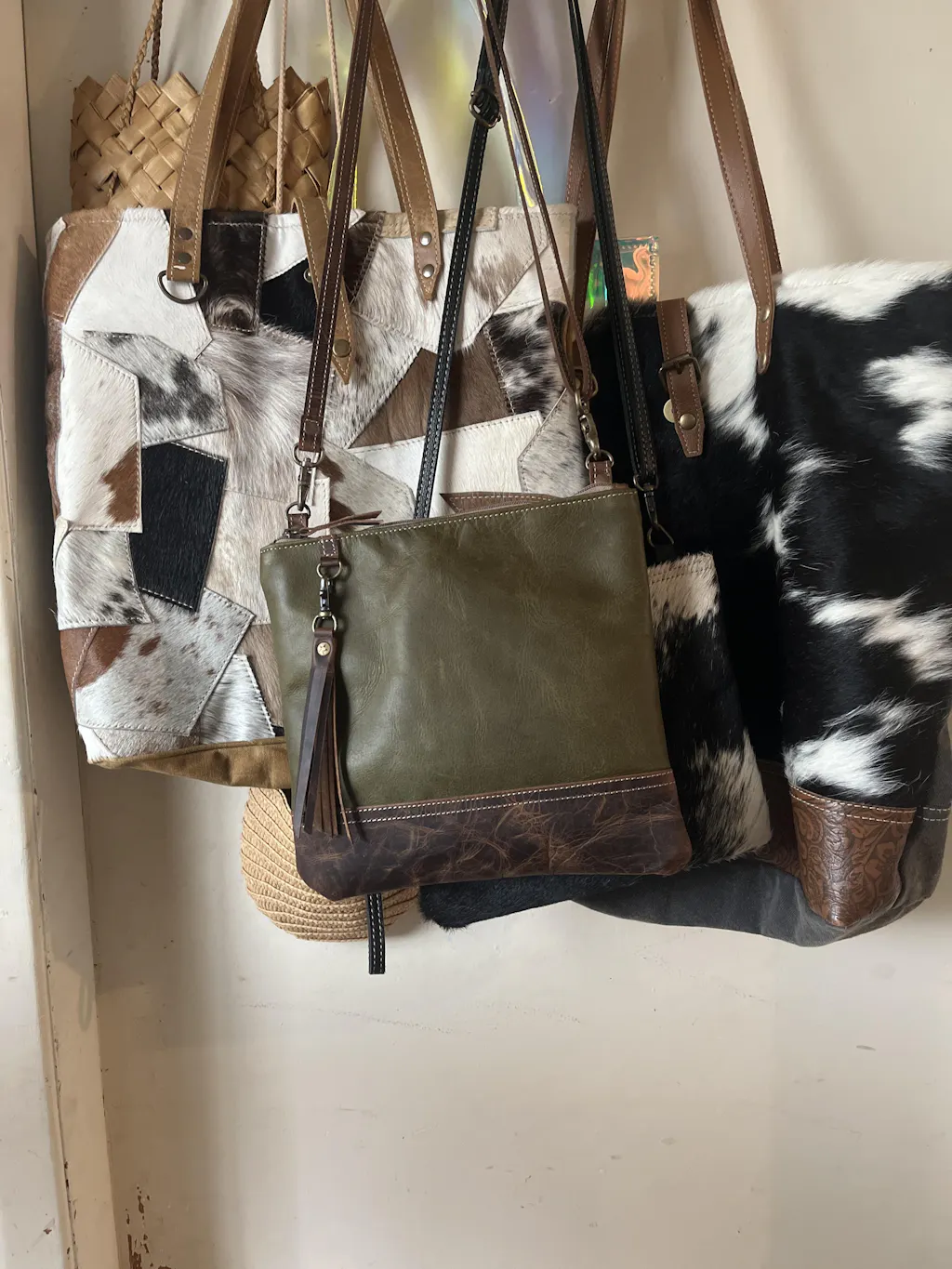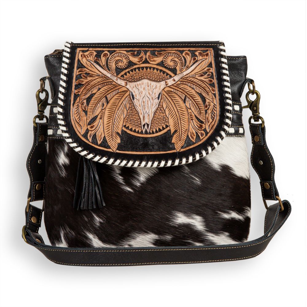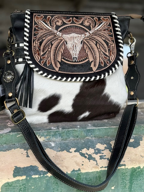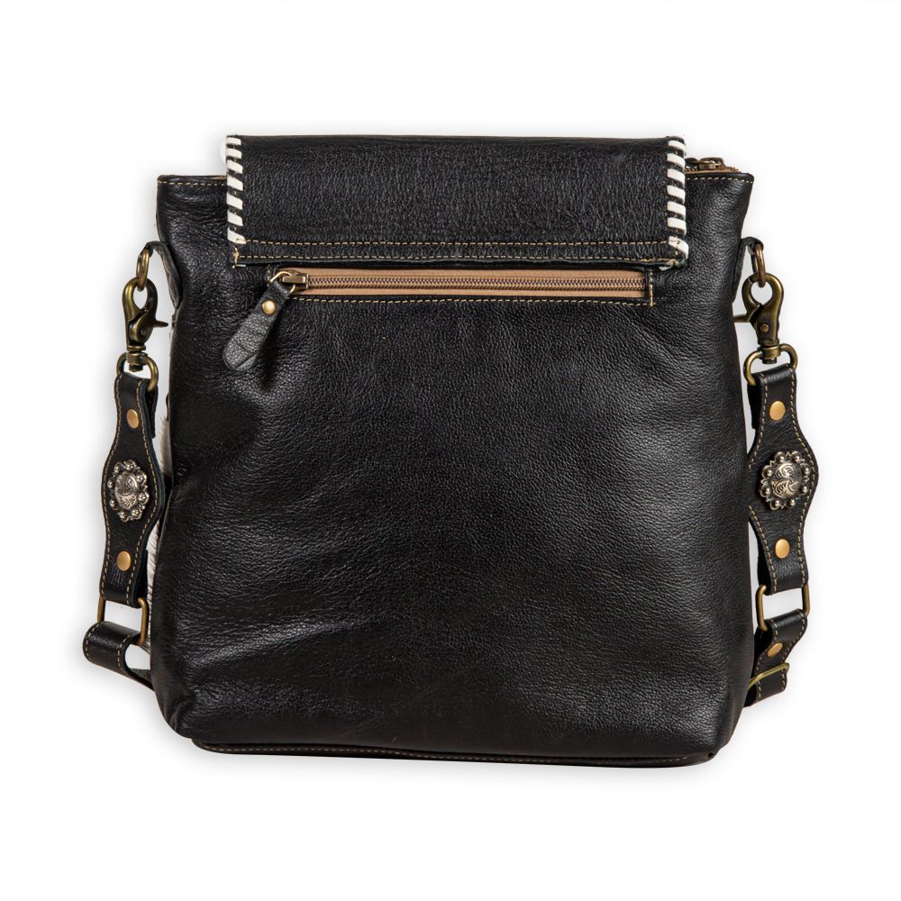 Each bag has a unique cowhide pattern on front and coal black leather on the back.