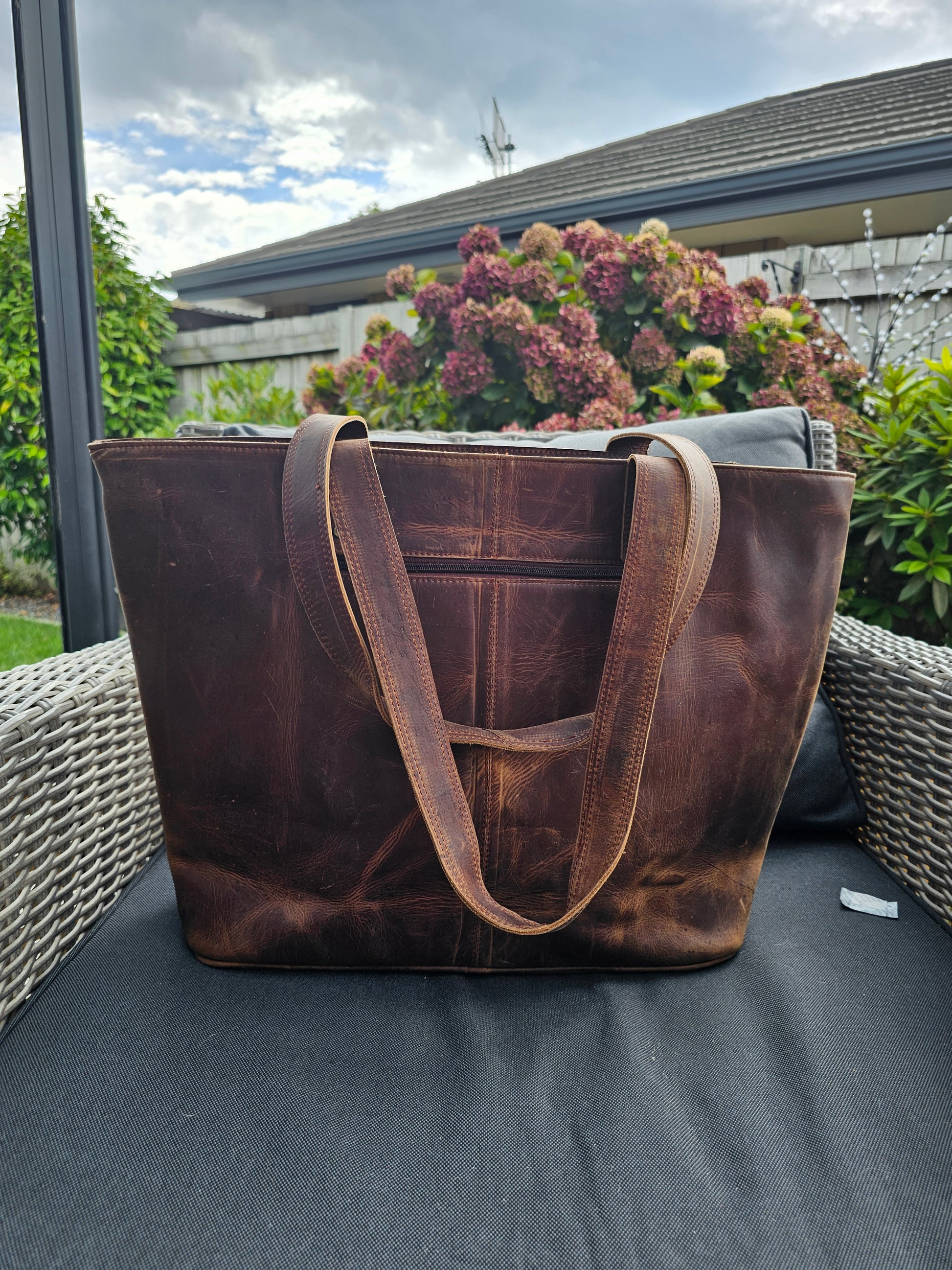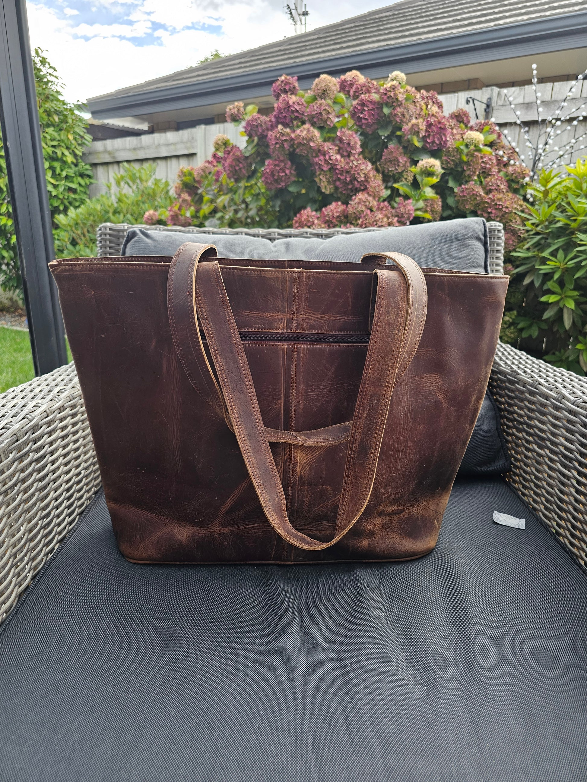 • Zipper across the top of the bag for security (and zipper has a leather pull tab).