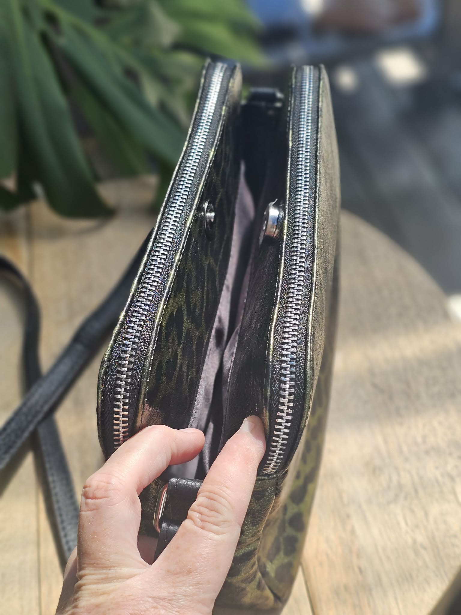 Crafted in Florence by Italian artisans, this genuine leather crossbody blends rock‑chick attitude with refined, effortless cool. Her black leather base is overlaid with a deep olive green animal‑print shimmer that catches the light just enough to make you look twice.