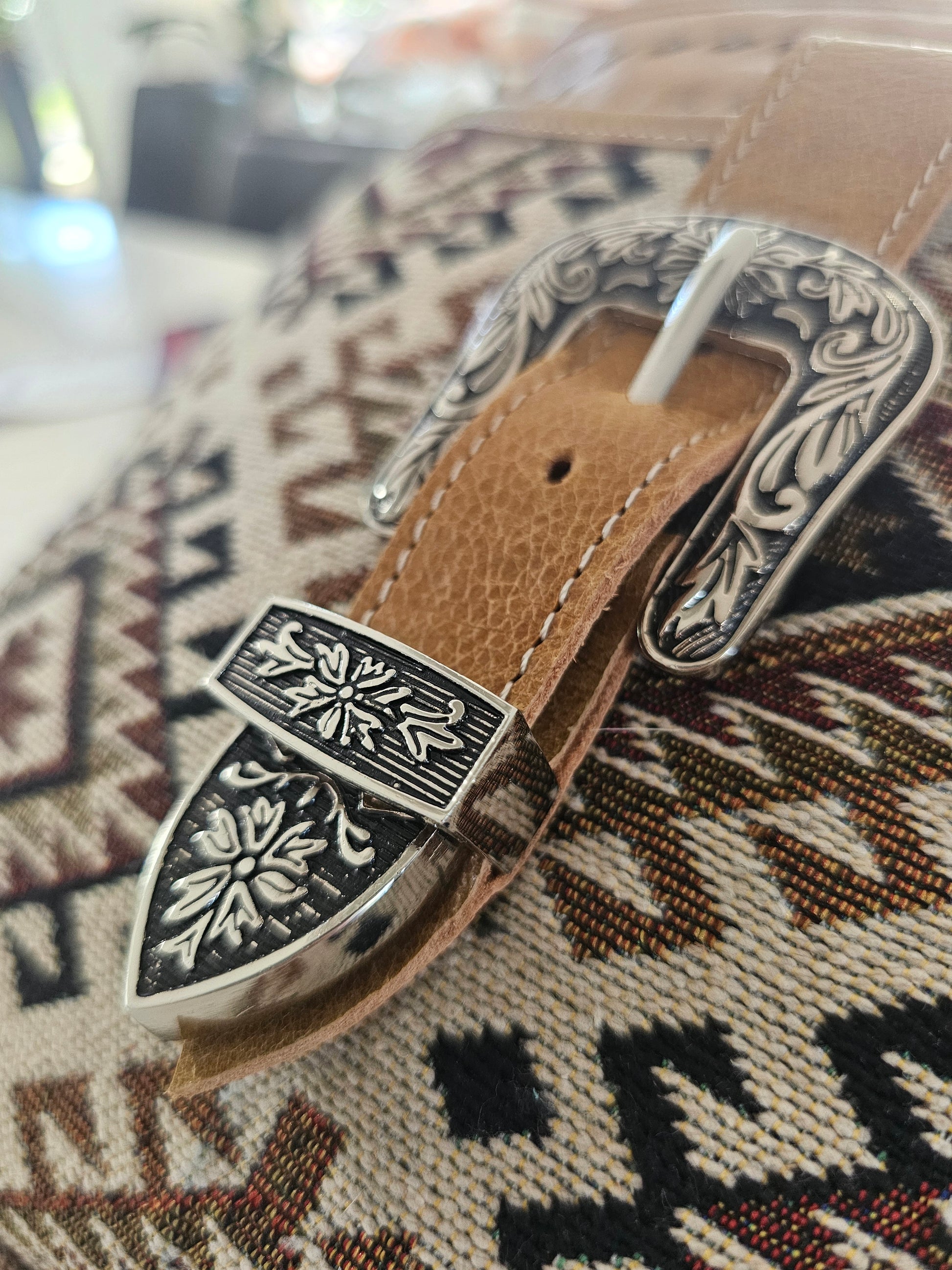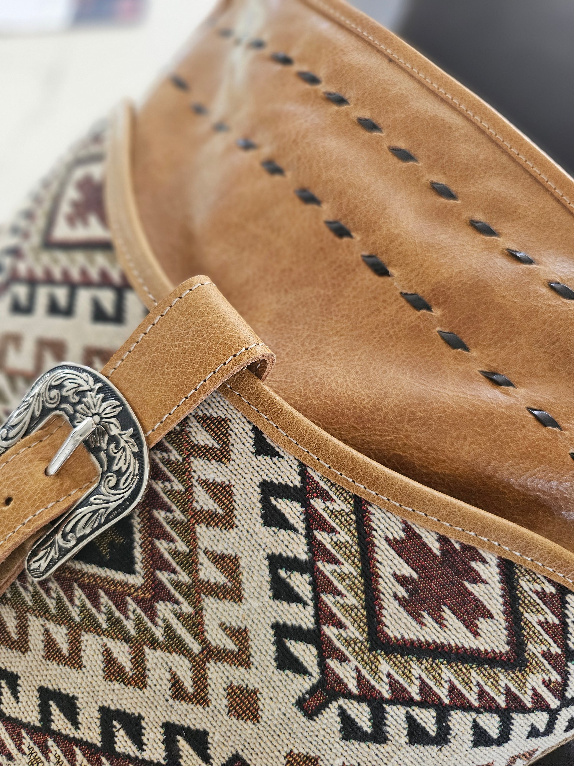 Debs is where rugged charm meets artisan elegance. She’s crafted from beautifully aged leather paired with recycled saddle blanket rugs in earthy tones, creating a look that’s rich in texture and story. Her decorative front design features a bold buckle detail and intricate stitching that screams craftsmanship.